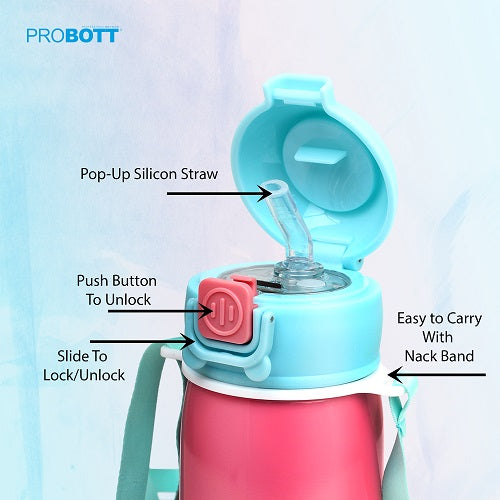 Probott School Champ 370ml Sipper Bottle for Kid with Straw & Strap to Carry, Pink | Stainless Steel Hot & Cold Water Bottle for Kids