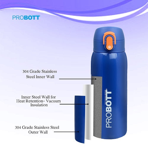 Probott Little 390ml Thermoses Vacuum Insulated Flask, Stainless Steel Water Bottle for Kids, Dark Blue | One-Click-Open Leak-Proof Locking Flip Lid