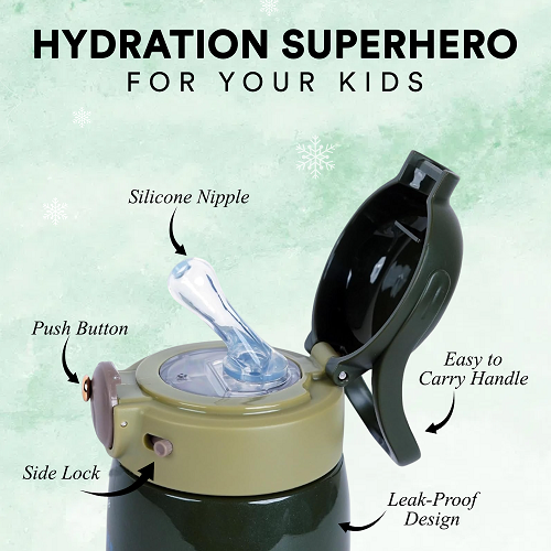 Probott Cool Kid 360ml Hot & Cold Sipper Bottle for Kid with Straw & Handle, Dark Green