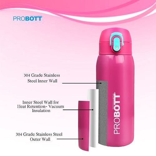 Probott Cutie 320ml Stainless Steel Hot & Cold Sipper Water Bottle for Kids, Pink| Double Walled Vacuum Flask |Push Button With Locking System