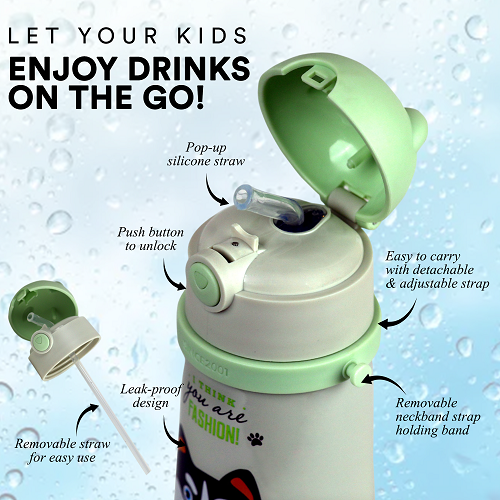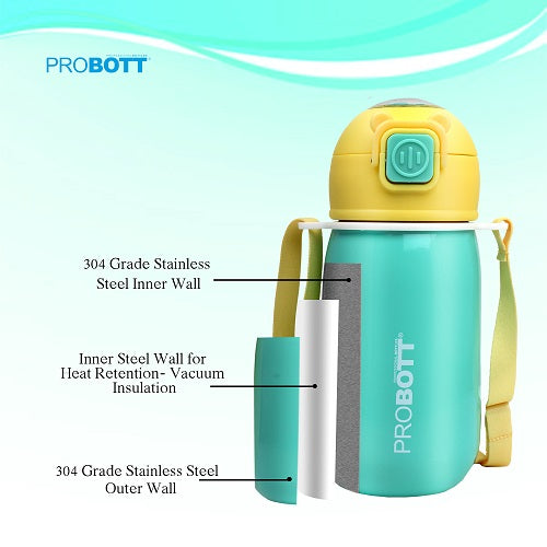 Probott Tom 350ml Hot & Cold Vacuum Insulated Flask Sipper Bottle with Straw & Strap for Kids, Green
