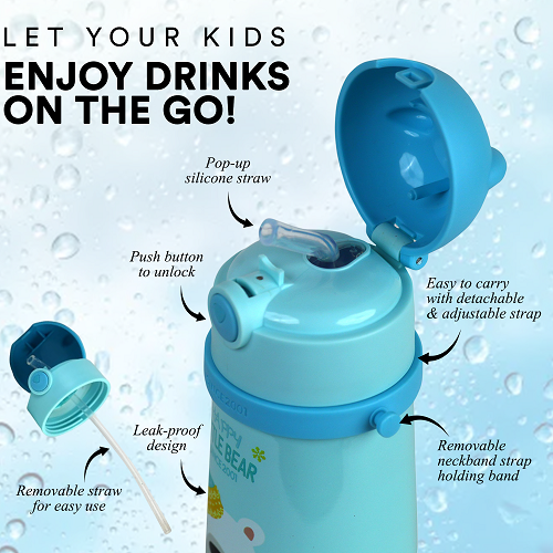 Probott Tom 350ml Hot & Cold Vacuum Insulated Flask Sipper Bottle with Straw & Strap for Kids, Blue