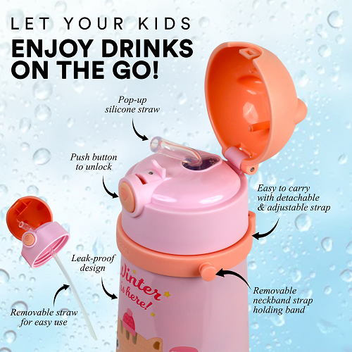 Probott Tom 350ml Hot & Cold Vacuum Insulated Flask Sipper Bottle with Straw & Strap for Kids, Pink
