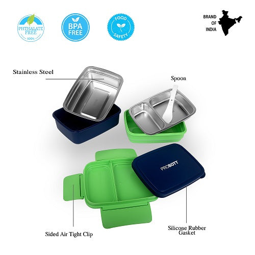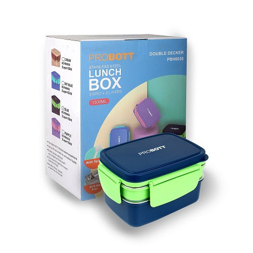 The Probott Double Decker lunch box is very convenient. Spacious, sturdy, and comes with a spoon. Perfect for school or office use, and the blue color looks great