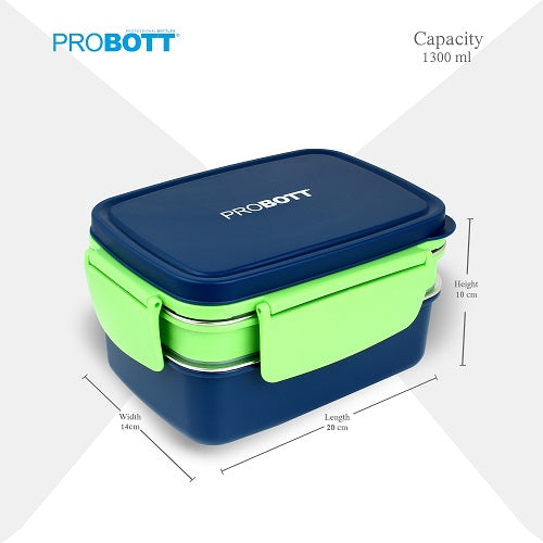 PROBOTT Double Decker 1300ml Stainless Steel Lunch Box, 2 Layers with 3 Grid, 1 Spoon Tiffin Box, Lid Made with Heavy Quality PP Material Perfect for School, Office Use | Blue