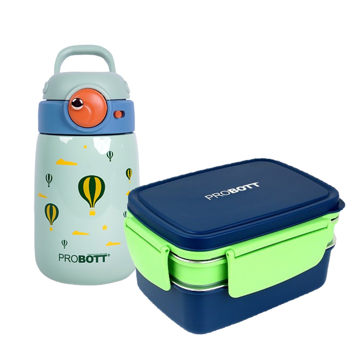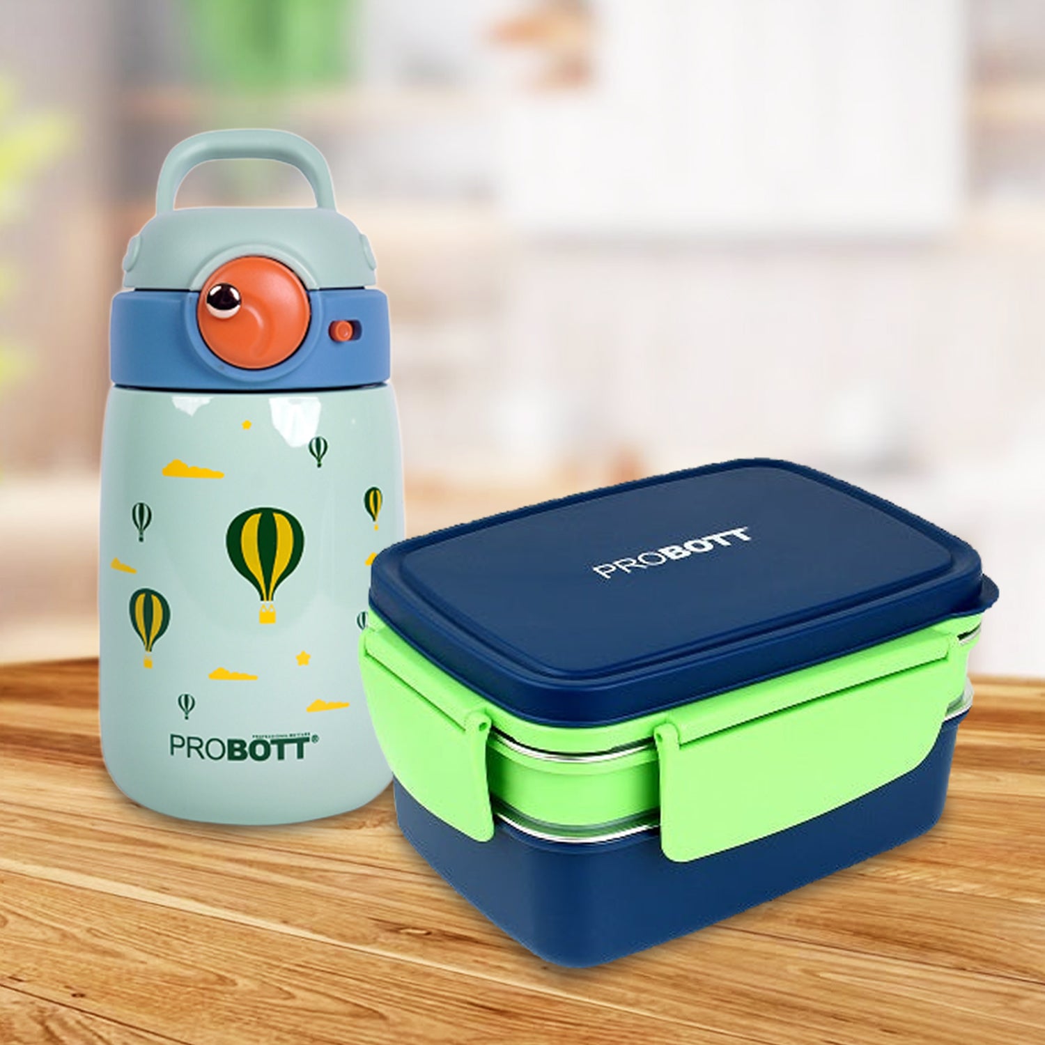 Probott LunchMate 1300ml Double Decker Tiffin Box with 360ml Cool Kid Hot & Cold Sipper Bottle (Blue & Light Green, Combo Pack)