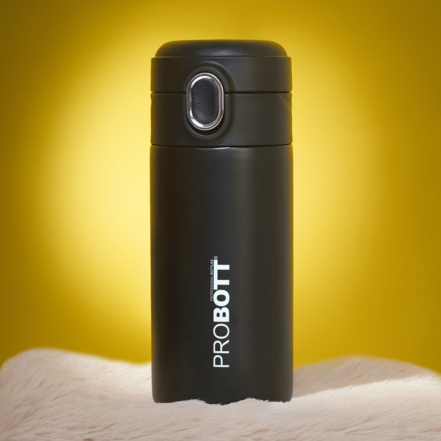 Probott Pride 400ml Thermosteel Hot & Cold Insulated Stainless Steel Travel Flask, Black | Spill Proof | Coffee Tea Mug | Juice Mug | Easy Grip Easy to Carry