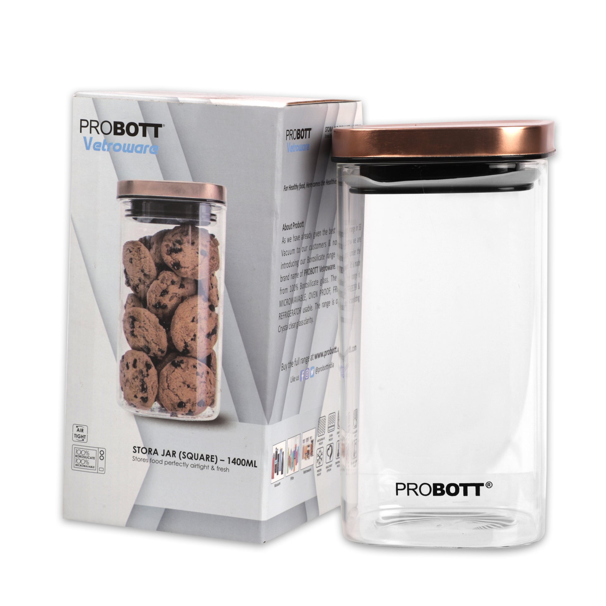 The Probott Vetroware 1400 ml Square Glass Jar blends functionality with elegance.